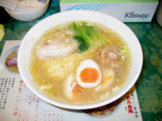 スープは、これも黄色味の強いトリガラだしの塩味で、コクというか滋味あふれる味わいだが、やや塩味が強い
