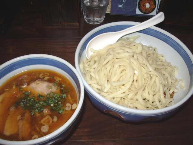 味玉つけ麺 @850 麺は、「特製平打ち麺」とあるが、色白やや平打ち程度の極太直麺で、ちょっとゆですぎの感じで見た目ほどのツルツル感はないが、ムッチリした食感はなかなか 量は、写真ではかなりの量に見えるが、実は底に水切りざるが敷いてあり、300g弱 つけだれは、茶色やや濁のとんこつしょうゆ味で、全体に香辛料のような香りがして、辛味も相当効いている、ちょっと独特の味わい 脂にサラダ油のような匂いがあるのが残念 トッピングは、肩ロースチャーシュー1.5枚、正方形の厚切りメンマ3本、味玉1/1 |