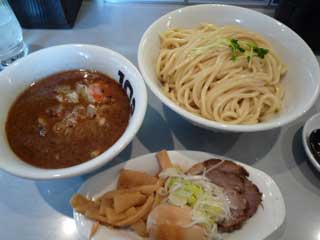 特製つけめん大盛 @1000 麺は、ツヤツヤとした黄白色の極太直麺で、ツルツルした舌触りともっちりした歯ごたえが特徴的なもの 自家製で、量は300g つけだれは、かなり粘度が高く濃い味わいの濃茶色強濁とんこつ魚介しょうゆ味で、多量の魚粉が入っているがざらつきはあまり感じない スープ割りはポット入りのカツオだしで、さっぱりした味わいに変わる もちろん「焼き石」もある トッピングは、つけだれ中に柔らかいモモチャーシュ-小3枚とメンマ、別皿に特製分としてモモチャーシュー小2枚、味玉、メンマ、ネギ |