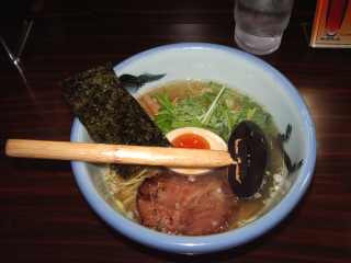 塩らーめん @750 麺は、黄白色不透明の角断面ややちぢれ極細麺を、固くゆであげたもの。 スープは、透明でほんの少し黄色みがかったトリガラ魚系塩味で、無化調のあまり自己主張しないはんなりとした味わいは、まるでダシ茶漬けのダシそのまま トッピングは、香りよく炙ってある肩ロース厚切りチャーシュー1枚、半熟味玉1/2、これもほとんど色が付いていない自然な色合いのメンマ、水菜、のり1枚、ネギは白ネギのみじん ZUND・BARはステンレスの丼だが、こちらは陶器の丼 |