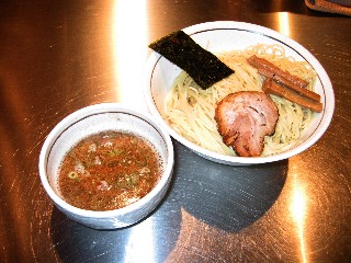 豚濁出汁つけソバ(特大) @850 麺は、黄色みが強く、固めというよりカチコチともいうべき、太直麺で、量は300g程度 つけだれは、とんこつ白湯しょうゆ味で、辛味は少ないが酸味があり、節系の強い香りがするもの 食べている途中に、そば湯の容器で供される割スープで割ると、しみじみと旨い トッピングは、麺にバララウンドチャーシュー1枚、のり1枚、メンマ少々 |