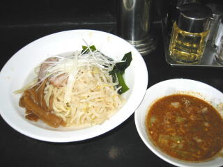 つけだれは、しょうゆベースに担々麺の胡麻ダレを少し加えたもので、やや辛め