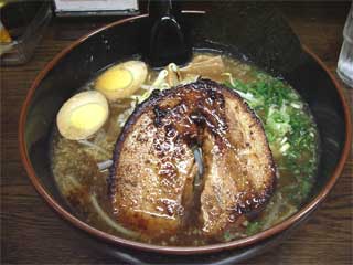 ぼっけもん醤油らーめん @950 麺は、黄色味が強い黄白色の低加水中細ちぢれ麺で、プルプルした食感ではあるが食べ応えは感じられない 「太麺か細麺がありますが」と聞かれて太麺を選択したものの、実際出てきたものは上記のとおり中細麺というしかないが、これが太麺なら細麺はすごく細いんだろうな 量は、120g程度か スープは、薄茶色濁のとんこつトリガラしょうゆ味だが、ホームページで立派なレシピを公開しているわりにかなりダシが薄く拍子抜けする 背脂が少々浮いている トッピングは、チャーシュー1枚、シャキシャキのもやし多量、歯応えのあるメンマ少々 チャーシューは、写真のとおり見た目にも圧巻で、直径12~3cm厚さ1cmほどもある大判厚切りバラロールチャーシュー公称重量125gを、ステーキペッパーか何かをまぶしてソテーした大胆なもの チャーシューというより、焦げ目の具合も含めステーキと呼ぶ方がふさわしい 食感は、ゆで加減がうまく、しかも程よくソテーしてあるので、カリッとした歯応えがある中にもしっとりしたジューシーさが際だち、なかなか佳である |
