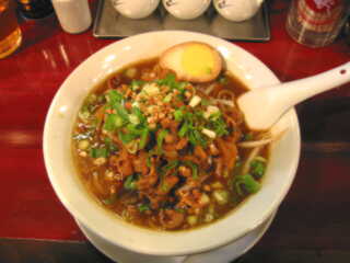 麺は、中細ややちぢれの硬質なもので、色は薄く透明感もある、と書きたいが、実際にはスープの色に染まっているのか茶色味をおびている