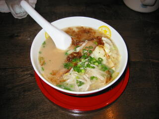 らーめん(濁り) @700 麺は、少加水の細麺で、かなりのアルデンテ状態で出てくる 量は少ない スープは、とんこつ白湯塩味基調で、鶏ガラなども使われているが、においのしないさっぱりしたもので、まろやかではあるが力強さはない トッピングは、やや煮すぎのような長方形トロ肉チャーシューを炙ったもの1枚、もやし、キャベツ青ネギ |