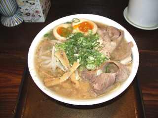 特製A1.5 @680 麺は、黄白色の低加水中細直麺で、固めではあるがややぼそぼそした食感 メニューによって差があるベースの麺の量に各0.5玉無料で追加でき、Aでは1.5玉で、200g位 スープは、透明茶色の豚肉でとったダシにしょうゆ味のもので、酸化鉄風の酸味のある独特の風味がするが、かなりの量のコショウが入っているためピリッとしまった味わいになっている チャーシューは一見牛肉かと見まごうような色の濃い、そして超薄だが歯応えとスジが残るという独自のもの数枚、半熟味玉1/2×2、メンマ、もやし、多めの青ネギ テーブルの上にある黄色くて甘いタクワンは、食べ放題 |