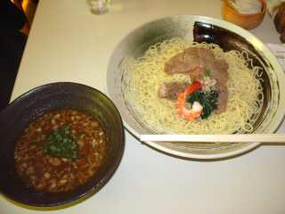 豚つけめん(450g) @700 麺は、白め(たぶん(^^)の低加水ややちぢれ太直麺で、かなり固い仕上がり 量は180g、450g、720gが同価格で選択できる つけだれは、焦げ茶(たぶん(^^)濁のとんこつしょうゆ味でカレー風味が効いている 玉ネギみじんが浮かび、サラッとしているが、塩味は強く、食べている途中で水を飲まずにはいられない つけだれの量が少なく、麺を食べ終わる頃には、ほとんど残らない トッピングは、柔らかめのモモチャーシュー3枚、茹でた小エビ1本、ほうれん草少々 |