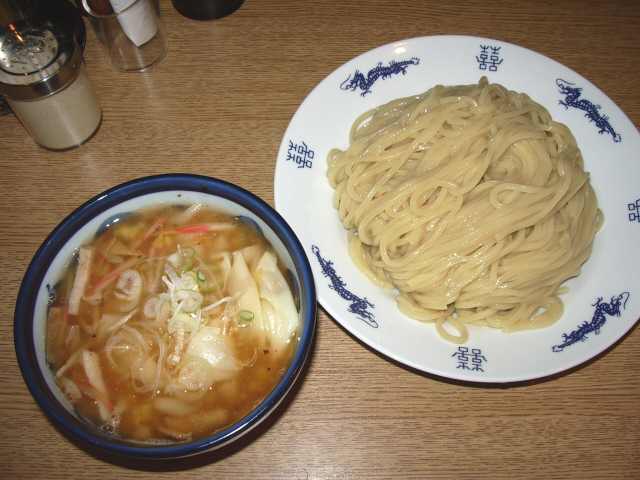 わんたんつけめん+大盛 @850+0 麺は、やや浅黒い黄土色の角断面極太直麺で、しなやかというかなんとなくグタッとしているが噛むとプチッとした歯応えがあり、吸水率が極めて低いためか表面がピカピカと光っている 量は350g程度か つけだれは、白茶色やや濁のとんこつ魚系しょうゆ味で、甘・辛・酸がそろって強いもの 柚子皮が入り、全体の味を引き締めている 3個入ったワンタンは大ぶりであるが皮が伸びきっているのが残念 その他のトッピングは、チャーシュー細切り、ナルト細切り、メンマも細い 普通盛、大盛、特盛も同額ですが、デフォルトのつけ麺で700円というのはちょっと高め |