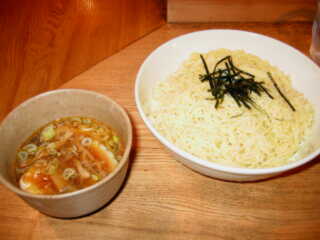 つけ麺2玉 @800 麺は、黄色い少加水ややちぢれの細麺で、ツルツルしたもの 量は一見多そうだが、するすると食べてしまう つけだれは、茶色い透明やや濁のとんこつ魚介しょうゆ味で、甘みが際だつが塩味も相当なもの そのままでは、魚介系はあまり感じないが、土瓶風の大きな容れもので出てくるスープをたっぷり入れて割ると、フワッとしつつもしっかりした煮干し系の味が楽しめます トッピングは、固めのモモチャーシュー薄いものが1枚、メンマ、半熟味玉半分、麺の上に申し訳程度のきざみのり |