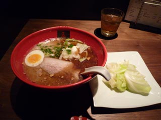 とんこつ麺+キャベツ @900+100 麺は、濃いめの黄白色の極太平打ちちぢれ麺で、なかなか味わい深もの スープは、白めのとんこつ白湯ちょっとしょうゆ味で、さっぱりとした味わいというかやや物足りない感じでもある 表面に少々マー油(「五行」では「焦がし」と称する) トッピングは、薄いが大ぶりのバラチャーシュー1枚、硬めの半熟味玉1/2、湯通しキャベツ少々 追加のキャベツは湯通ししたものが別皿で供される 全体に、上品さがウリといえよう |