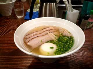 特製塩らーめん @950 麺は、白いそうめんのような極細直麺で、ゆで時間も1分ほどとそうめん並み アルコールの匂いが感じられる位の浅いゆで加減で、チュルチュルとした啜り心地が良いのだが、後半は延びてしまうのが残念 量は100g程度だが、小さいが深めのすり鉢型丼に入っているため、多めに見える スープは、ほんの少し色づいただけの透明感あふれるトリガラ魚介塩味で、うまみ過剰ではないがダシのコクに塩味の複雑さが加わって、かなり深い味わいである トッピングは、柔らかめの長方形型バラチャーシュー4枚、通常の穂先メンマとかなり異なった細い形状と塩味で色も白い穂先メンマ2本、半熟味玉1/2 蓮根駅で(と言ってはいけないかもしれないが)これだけハイレベルの塩らーめんが食べられるということ自体が驚きである |