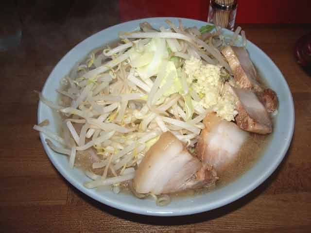 チャーシューメン @700円 麺は、茶色の二郎系にしては細めの平打ちで、低加水のうえに茹で時間も短いので、ボソボソ感がある 量は250g弱 自家製で、麺切れ終了をうたっている スープは、茶色っぽいとんこつしょうゆ味だが、二郎インスパイアとしてはしょうゆ味も薄めで、味の濃さという意味でのワイルドさはあまりない しかし、表面には、脂と背脂が層をなしており、ガツン度は高い トッピングは、厚みはあるが柔らかい脂身多めのバラチャーシュー小4枚、モヤシとキャベツ4:1の野菜は注文の都度茹でられるのでパリパリ感があるもの したがって野菜増しはニンニクコール時ではなく注文時にする必要あり |