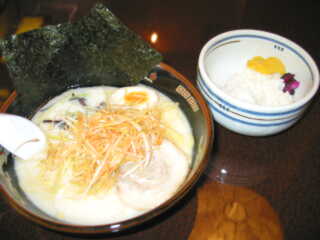 三河とんこつ中盛+白髪ネギ(麺固め、豚脂多め) @650+100 麺は、黄色くて透明性のあるややちぢれ細麺で、ちゅるちゅるした食感ではあるが途中でのびてしまう スープは、真っ白なとんこつ+とりがら白湯塩味で、においも少なく軽さが際だつもの 麺、スープとも量は少ない トッピングは、バララウンド(ただし不完全な巻き具合だが)チャーシュー1枚、キクラゲ、のり2枚、半熟味玉(薄味) 白髪ネギは、白髪ではあるがチャパツ風に染めの入った辛味付き(^^) 写真のライスは、ランチタイムサービスで、盛りつけもセルフ ついでに、丼も黒地に金彩で龍の絵が描いてある、はでなもの |