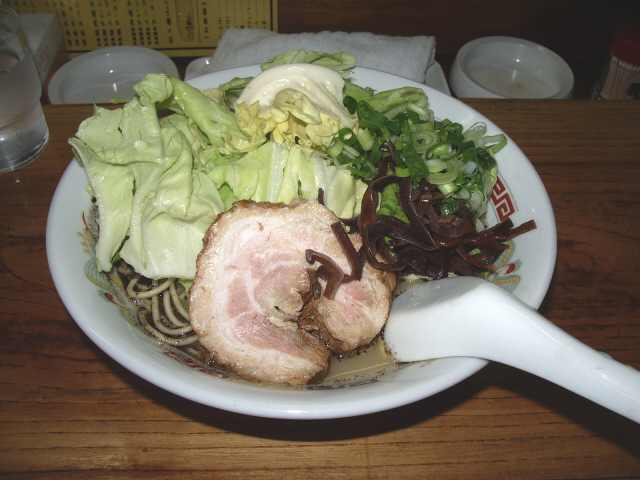 熊本キャベツ麺 @780 麺は、黄白色の少加水中細直麺で、アルデンテの仕上がりのためか、ちょっとモッサリとした食感 量は比較的少ないので、足りないときは替玉を注文することになる スープは、ダシがやや薄めで透明度もそこそこあるとんこつ白湯塩味で、大量のマー油が表面を覆っている このマー油は、黒いツブツブを含み、苦みも強いので、熊本風とは少し異なる感じ 塩味が強めであるが、量が少ないので、全部飲み干せてしまう でも替玉するときは飲み干さないようにね(^_^)b トッピングは、厚いが柔らかいバラロールチャーシュー1枚、大量の生だが柔らかいキャベツ、キクラゲ少々 |