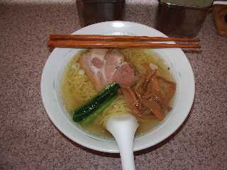 トッピングは、肩ロースチャーシュー1枚、小松菜、メンマ各少々