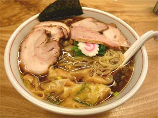 焼豚わんたん麺+大盛 @1150+150 麺は、白めの黄白色で透明感のある角断面縮れ太麺で、チリチリ感がありチュルチュルした喉ごしが特長だが表面は意外とザラザラしている 食べたことはないが、白河市の「とら食堂」で修行した店主が手打ちでつくるとら系の麺 量は200g強か スープは、濃茶色透明のとりがら魚介しょうゆ味で、見た目以上にしょっぱさがある 色は、しばらくすると麺もワンタンも茶色に染まるほど トッピングは、四角形で薄めのモモチャーシュー3枚に大型のバラロールチャーシュー3枚といずれも歯ごたえの良い2種類のチャーシュー、ワンタン5個、小松菜少々、ナルト1枚、のり小1枚 |