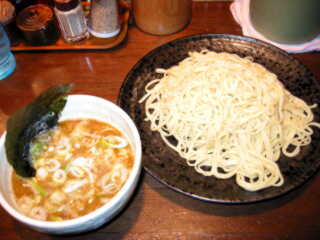 つけ麺(大盛)正油+ねぎ @650+50 麺は、不透明な白めで、やや太めの平打ち直麺を、かなり強いアルデンテに仕上げている 自家製麺で、量は440g つけだれは、泥のような茶濁とんこつしょうゆ味で、節粉が多量に入り、唐辛子もきいているしょっぱいもの カウンターに節粉が置いてあるので追加してみたが、デフォルト以上に味が濃くなるわけではない(ほどもともと節粉が多い) スープ割りのスープも、そもそも茶濁 トッピングは、細切りの短冊チャーシュー 追加のネギは「多めにしときました」との一言があった程度で、それほど多くない カウンター上に、刻みタマネギもあり |