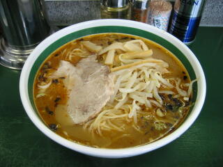 スープは、焼豚煮汁をタレとしたかなり濃いめのとんこつしょうゆ味で、揚げねぎと唐辛子が入っている