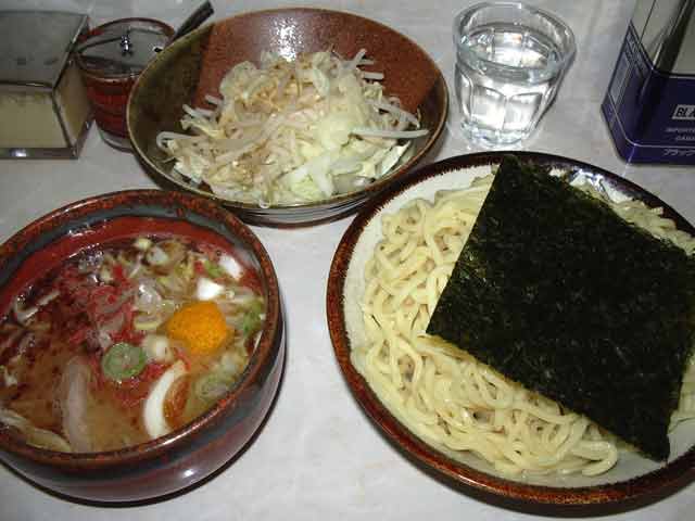 海のつけ麺+大盛+もやし・キャベツ @750+100+100 麺は、黄色い角断面太直麺で、硬めと頼んだのでポキポキした食感 量は、350g程度 つけだれは、濃い赤茶色強濁のとんこつ白湯しょうゆ味で、魚粉も混ざっているようだが、ライトな味わいである しかし、海を感じさせるのは魚粉じゃなく、干し桜エビ トッピングは、大きいが薄い肩ロースチャーシュー1枚、半熟玉子1/2、短い短冊となったメンマ、麺の上に大判ののり1枚 追加トッピングのもやし・キャベツは別皿で供されるが、ちょっとゴマ油がかけられており、つけだれに入れると香りが楽しめる |