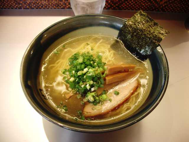 潮(うしお)そば @700 麺は、黄色みの強い中太ややちぢれ麺で、かすかにカンスイのにおいが残るようなところはちょっと残念 量は少なめ スープは、ほとんど無色でほんの少し濁りがある、まさに潮汁のよう色合いで、ダシも潮汁程度に弱いというか(^^ゞ、いや上品というべきか トッピングは、ちょっと燻蒸してあるような感じの厚めのバラチャーシュー1枚、メンマ、のり1枚 丼は小さめの深鉢で、醤油味の醤油そばとは色違いでサーブしている |