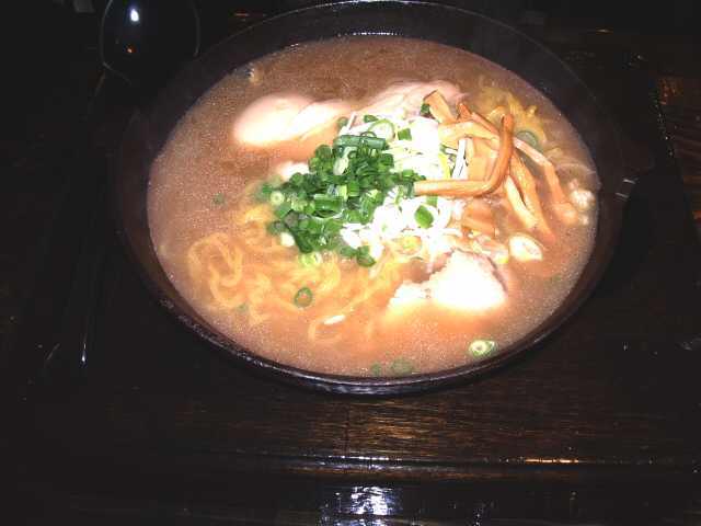 スープは、一見味噌のようなうす茶色濁のとんこつ魚系しょうゆ味で、強い煮干しの香りがするなかなか懐かしい味わい