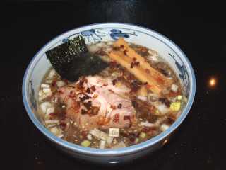 煮干しら〜めん+大盛 @800+100 麺は、白めでやや透明感のある黄白色で、ちりちりとちぢれた固めの細麺 量は少なく、大盛で一般の普通盛程度、丼も小さい スープは、七重の味というが、ほんのりトリガラ魚系塩味に少し混ざる程度のしょうゆ味で、さっぱり・薄めのあじわい 全体に、悪くいえばお茶漬けの汁といった印象だが、丼の底に煮干粉が層をなして沈んでいる点や、表面に多量の焦がしネギと白ネギが浮いている点で、大きな違いはある トッピングは、部分的にだが焦げ目がつき、歯応えも十分というか要するに固い(^^)大きな肩ロースチャーシュー1枚、板のような大きめでしっかりした味わいのメンマ4本、小さなのり1枚 |