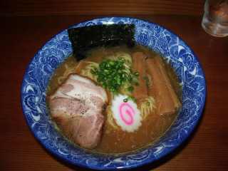 らーめん @700 麺は、黄色の中太ややちぢれで、つるりとした食感 量は、少なめ スープは、濃い黄土色濁のとんこつ魚系Wスープしょうゆ味で、節粉が泳いでおり節の香りが強烈なインパクトを生んでいる トッピングは、ちょっとコショウが振られた肩ロースチャーシュー1枚、太くて茶色い枕木のようなメンマ3本、のり1枚、なると1枚は珍しい 藍の染め付け風の丼 |