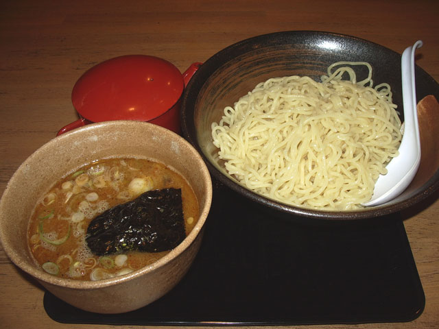 つけ麺+麺大盛 @700円+0円 麺は、やや透明感もある黄白色の中太ややちぢれ麺で、柔らかめの仕上がり 極太麺流行のつけめんの世の中に対し、相対的にやや細めという提案も新味があってよいかもしれない 量は、300g つけだれは、茶色強濁のトンコツトリガラ白湯魚系しょうゆ味で、かなり節系の味わいとざらつきが感じられるもの 塩味はあまり強くなく、全体に甘味が強い丸い味で、ガツン度は低いがこの麺には合っていると言えよう 最初から付いてくるスープ割り用のスープは魚系で、割ると節の香りがかなり立つ トッピングは、つけだれ内に、バラチャーシュー端切れ少々、メンマ少々 |