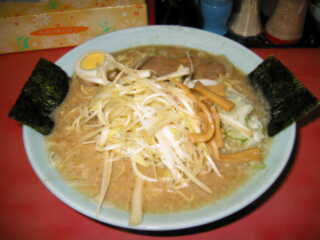 ねぎラーメン大盛(固め、多め) @800 麺は、細い直麺だが、かん水多めで黄色味が強いので、博多風というとちょっと違和感あり スープは、ごらんのとおり、濁りがあるトンコツ白湯であり、背脂も浮き、とろみも強い また、だしの素材にモミジも使うし、かすかに魚介系の香りもたつ、かなり濃い味わいのもの きざみネギはタマネギも入っているらしい カウンターには、紅ショウガ、辛し高菜と、これは定石どおり
