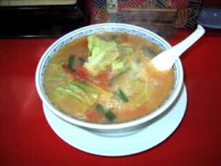トマト(藩)とキャベツ(捲)の炒煮(ニラ、挽肉入り)が載り、オレンジがかった黄緑色がスープの上に広がり、ちょっと酸味の効いたしゃれた味になっている