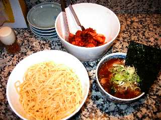 写真上方の大きな白い丼は、サービスのキムチで、マイルドな辛さと深みのある味ですばらしい