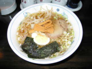 塩ラーメン @650円 麺は、白い細めのややちぢれ多加水麺で、柔らかめというかちょっと茹ですぎ 手打ちではなく、「菊忠」という白河の製麺会社製 スープは、塩味ながらなぜか茶色っぽいもので、さっぱり系 少しかん水の臭いが残る チャーシューは残念ながら古い |