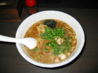 豚そば @650円 麺は、極細直麺を固めに仕上げてている スープは、一見焦げ茶色のとんこつしょうゆ系だが、カツオの香りが先に来て、口に含むと野菜の味もする複雑なもの トッピングは、ターローのくずれたもの、芽ネギのような極細の青ネギ、タマネギみじん 全体に量は少なめ |