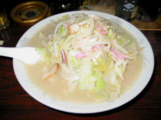 ちゃんぽん @750 麺は、もちろん太いちゃんぽん麺だが、かなり白めのもので、長崎から取り寄せるという スープは、ややさっぱり系だがコクのある白湯スープで、無化調 塩味は薄め 具は、ちゃんぽんの定式通り、キャベツ、もやし、タマネギ、豚肉、イカ、エビ、あさり、紅いかまぼこ、ちくわのほか、テンプラ(さつま揚げ)が入る 器は、本場長崎と同様浅い丼で、写真のように、具が丼の縁以上に盛り上げられている |