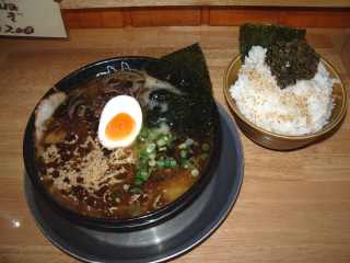 木のログハウス風の造りで、大きなのれんをかき分けて店内に入ると、壁やカウンターに木が多用され落ち着いた内装です。しかし、レ型カウンター9席、I型カウンター2席+ベンチと、客席が多い割に客席空間が狭いのは残念。 また、イスが丸太であるのも、雰囲気はいいのですが座りづらいという難点もあります。 スタッフは3人。 もともと町田市内にある熊本ラーメンのお店「九州ラーメン火の国」ののれん分けのようです。 ゴマを振ったりするのは、このお店のやり方を受け継いでいるのでしょうが、これはカウンターの上にでもゴマの容器を置いてお客の自由にしておいたほうがよいと思いますねぇ。 でも、そのゴマやゴマ油や量は別として、かなり本格的な熊本ラーメンであることは間違いないでしょう。 |
