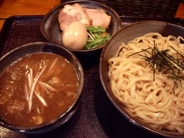 特製醤油豚骨つけ麺(大盛) @1000円 麺は、白めの低加水ややちぢれ中太麺で、幅が不揃いなので手打ちのようにも見えるが三河屋製麺製らしい 仕上がりが、結構硬めで、ちりちりと不揃いのところが唇に好ましく、つけだれの絡みもよい 量は、大盛は普通盛の倍で200gと表示されているが、それほどでもないと感ずる 普通盛は、そば屋のような竹の半割のような器に上品に盛られているが、大盛はただの丼 つけだれは、濃茶強濁のとんこつトリガラ白湯魚粉しょうゆ味で、酸味、辛味はほとんどなく、塩味も見た目ほど強くない ひたすらとんこつと魚粉の強い味わいが支配的であり、しかもドロドロ度(^^)が極めて高い このドロドロ度とチリチリの麺の相乗効果で、つけだれがどんどん口に入ってくるためか、食べている途中でやや飽きが生じてしまい、カウンター上の酢で味の変化を付けたくなる スープ割りは、和風と豚骨の2種から選べるが、和風の方が変化が感じられてよいだろう トッピングは、デフォルトでつけだれ中に棒切りチャーシュー2~3本、特製の分が別皿で肩ロースチャーシュー、モモチャーシュー各厚切り1枚、甘みの強い半熟味玉2/2、細いメンマ多め、水菜少々 |