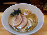 醤油ら〜めん @700円 麺は黄白色の細麺で、ぷつぷつした食感のもの。 量は120g位。 スープは茶色透明のトリガラ魚介しょうゆ味で、最初はさっぱりした味のようだが、だんだんに深いコクが感じられ、最後まで飲み干してしまいたくなる高レベルなもの。 そして最後まで飲み干した時、のどが渇くほどではない薄めの味付けであるが、旨みが十分で満足感はある。 ただし、スープの量は少ない。 トッピングは、少し厚みがあり噛み応えもある肩バラチャーシュー1枚、穂先メンマ細いが2本、近年では珍しいナルト1枚、岩海苔?少々。 塩ら〜めん+肉増し @700円+200円 麺は、醤油ら〜めんと共通。 スープが塩だけに、湯切りの不十分さからくる若干のカンスイ臭が感じられるのが残念。 スープは透明ほんの少し濁のトリガラスープ塩味で、しっかりした塩味はあるが、ダシのうまみはちょっと少なめ。 トッピングは、茹でたトリムネの厚切り2枚(デフォルトは1枚)、バラロールチャーシュー2枚、穂先メンマ2本、ナルト1枚、岩海苔?少々。 トリムネはもう一工夫必要と思う。 |