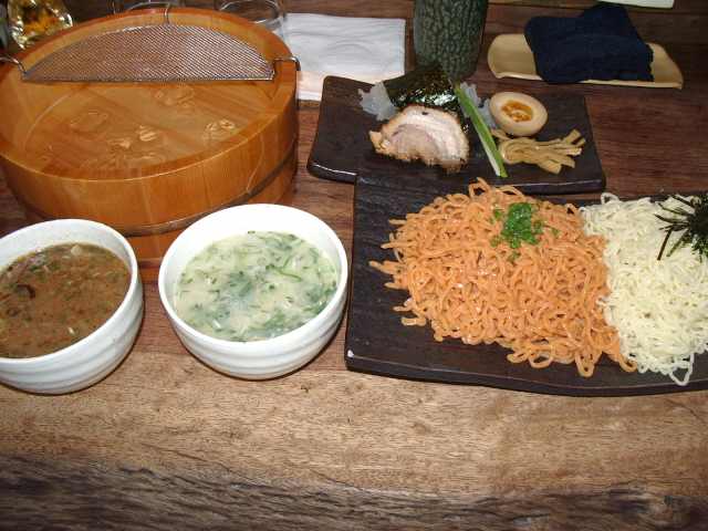 合い盛りつけ麺 @950 麺は、普通の麺に、青ノリ麺など4種類ほどのうちその日に打たれた変わり麺のなかから選択した麺のセットとなる 今回は、唐辛子麺を選択 普通の麺は、黄白色でやや透明感もある低加水の極細ちぢれ麺で、プツンとした歯応えがある 麺の上に糸状のきざみ海苔 唐辛子麺は、かなり濃いオレンジ色の極太ちぢれ麺で、プルプルした食感だが、熟成のしすぎなのかプツプツ切れているのがおしい 濃い色のわりには、辛いというほどではない 麺の上に青ネギ 量は、両方あわせて300g強 つけだれも2種類出てくる 茶色濁の方は、トリガラ白湯魚系しょうゆ味で、かなり濃い味わい 白濁の方は、粘度の高いトリガラ白湯塩味で、ユズが入っているため、キリッとした味わいとなっている ここで、出題(^^) 写真左上の桶は、氷水入りのタライであるが、何のために使うものか? 答えは、後半だれてくる麺を再度シメるために使うのだそうな トッピングは、別盛りで、柔らかなバラロールチャーシュー1枚、中まで色が付いて味もしっかりと強い半熟味玉1/2、白キクラゲ1枝、10cmほどの小ネギ3本 |