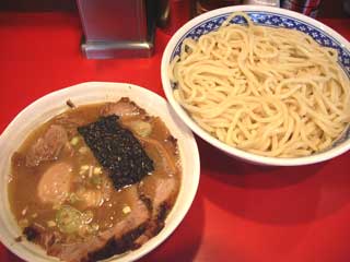 勢得つけ麺大盛 @1100 麺は、讃岐うどんと見まごうばかりの白めで透明感ある角断面極太直麺 もちもちとした弾力とコシがある自家製麺で、すすったり飲み込むことはできないため、口の中に持ち上げてモグモグと噛むことになるが、しまいにはアゴが疲れてしまうほど 時間が経つと表面がだれてくるところは舌触りとしてはやや問題か 量は400gほどはあろう つけだれは、焦げ茶濁のとんこつ魚介醤油味で、動物系と魚介系のスープを4〜5人前づつ温める、いわゆるWスープ中鍋系(^^ゞ つけだれの濃度は高く、たれとのバランスがなかなか取りにくい極太麺でも、十分たれを持ち上げてくる 最終的につけだれの温度が下がり量が少なくなってしまうのが残念ではあるが、スープ割りを頼むと、スープのほかに、白髪ネギ、おろし大根を入れてくれ、さらにおろし生姜の汁をちょっと加えてくれるので、さわやかさを演出する独自のスープ割りになるのがうれしく、残念さなど一蹴してくれる |