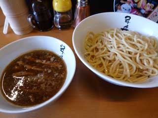 つけ麺 @700円 麺は濃い目のベージュ色太麺で、かなりのアルデンで硬いうえ、もっちりしたコシもあるもの。かなり水準の高い自家製麺。 量は250g。 つけダレは、褐色強濁のとんこつ魚介系しょうゆ味で、背脂が少々浮いている。脂量全体も多い。 ちょっと口に入れるだけで、強烈な甘さが先に来るが、変な味ではなく臭みもない。ただ、この甘さについては好き嫌いが分かれるところだろう。 スープ割りをお願いすると、かなり香りのよい節系の割りスープを注いでくれるが、それでも甘みはかなりのレベルである。 トッピングは、薄いモモチャーシューを細切りにしたもの3〜4枚、濃茶色のメンマ少々。 |
