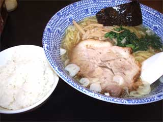黄金塩らーめん+半ライス @600+0 麺は、黄色みの強い黄白色の中細直麺で、表面のつるつるした食感が心地よいが、ごく普通の中華麺ではある 量は、120g程度 スープは、うんちくに「北海道で出会ったのがきっかけ」と書いてあり、見た目は確かに函館風で、まさに黄金色透明のトリガラ魚介コンブ和風塩味 しかし、だしの味わいは平板で、塩味もきついという、あまり期待しすぎてはいけないレベルかな トッピングは、歯ごたえがなかなか良いおおぶりの肩ロースチャーシュー1枚、穂先メンマ少々、のり1枚 営業時間内いつでも半ライスサービス |