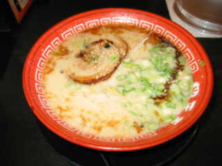 とんこつ醤油ラーメン @600 麺は、黄色い多加水と思われる細い直麺で、固くてツルツルの食感 量は少なく、替玉が必要 スープは、まさに大阪で主流のとんこつ白湯醤油味で、さっぱりしている バララウンドチャーシュー2枚というのがお得感を出しているが、それ以外は青ネギ少々とちょっとさびしい |