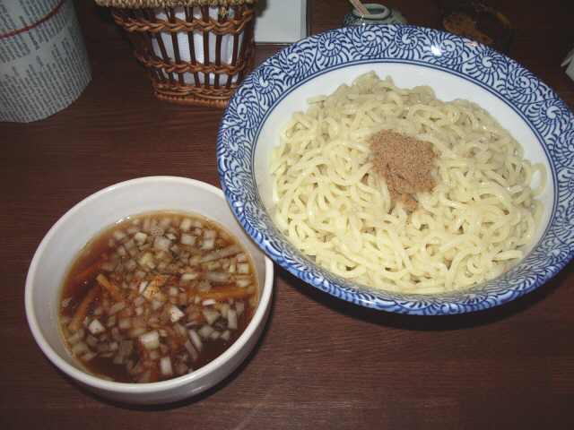 つけめん(中) @750 麺は、クリーム色の中太ややちぢれ麺で、チュルチュルした食感のなかなかの水準のものだが、熟成の進みすぎかプツプツに短く切れてしまっていたのは残念 量は300g位、並盛も中盛(1.5玉)も同額 麺の上にある茶色いものは節粉で、かなり新鮮なもの 幅広の飾り縁が付いたスープ皿風の丼は、ちょっとめずらしい つけだれは、薄茶色透明なトリガラ魚系しょうゆ味で、辛味が少々するが、かなり和風が強い味わい トッピングは、小さなチャーシューの塊、メンマとシンプル |