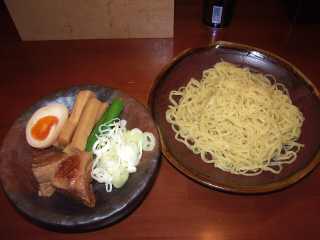つけそば @750 麺は、透明感のある黄土色の角断面やや平打ち中太直麺で、伸びがあるもの 量は、200g程度 つけだれは、一見味噌かと見まごう黄色みの強い黄土色濁のとんこつトリ白湯魚系しょうゆ味で、あまり塩味は強くない 写真に、つけだれがない、というのは早合点で、左下のトッピングが載った皿の下に、トッピングの皿とお揃いのつけだれ小鉢が隠れているのだ ポットで付いてくる白濁スープでスープ割りにすると、少し魚系の香りがする トッピングは、角煮風のチャーシューというか煮豚2個、半熟味玉1/2、太くて柔らかい薄茶色のメンマ5本、小松菜少々 どこかかすかに薫製の香りがするのは、ひょっとしてハムをダシに使っているのか、それとも気のせいか |