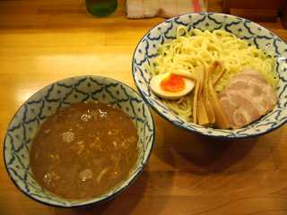 つけ麺+中盛 @750+0 麺は、透明感もある淡黄色の極太ややちぢれ麺で、つるつるした食感ともっちりした歯応えで、大成食品製 中盛は300g(普通盛200gと同料金) つけだれは、茶色強濁のとんこつとりがら魚系しょうゆ味で、濃厚なダシの味わいに、塩味、辛味、酸味もしっかりしたもの ちょっとざらつく舌触りは、お手軽な魚粉ではなく、さまざまな材料を7時間煮詰め、裏ごしをしたポタージュで、肉片なども混ざる 材料にも相当凝っているらしい スープ割りのスープも肉系のスープで、ダシの味わいは薄くなることがない トッピングは、肩バラチャーシュー大1枚、半熟味玉1/2、メンマ |