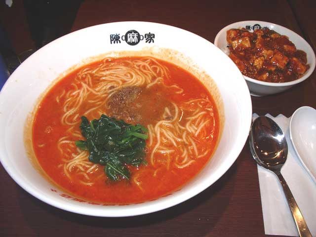 担々麺セット @880 麺は、ラー油にまみれてちょっとよくわからないが黄白色不透明の低加水細直麺で、柔らかめの仕上がり 量はかなり少なく、100g程度 スープは、ラー油の下に広がる黒すりゴマ入りのしょうゆ味で、ダシの味は定かではない、というか薄い 辛みは見た目ほどではない トッピングは、これもあまり辛くはない豚の肉味噌、小松菜少々 全体に、担々麺のような味はするようにも思うが、いかんせん味に今ひとつ深みがなく、すりゴマの味、肉味噌の味、ラー油の味がばらばらに感じられる ダシの薄さは、後日醤油ラーメンを食べてみて、再確認している 陳麻飯はいわゆる麻婆丼であるが、業務用ミートソースのような妙な甘さが感じられ、トロミもややつきすぎといえる |