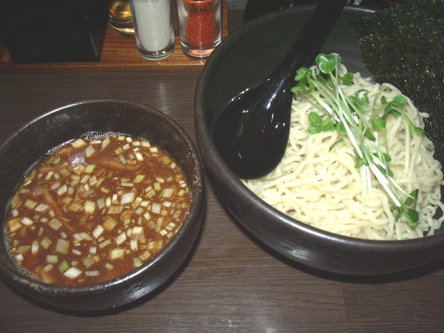 つけめん+大盛 @650+100 麺は、黄白色の中太ちぢれ麺で、透明感ある中でも芯の通ったアルデンテ状態の仕上がりで、ややボソボソ感はあるもののプツンとした歯触りが心地よい 量は250g位 つけだれは、茶色強濁のとんこつ魚系しょうゆ味だが、魚粉がかなり混じっており底にもどろりと溜まっている 酸味、辛味は少々だが、とにかく濃さを楽しむという感じで、スープ割りしても濃さが変わらない スープ割りの際、店主から「濃かったら言ってください」」と、ひとこと添えられ トッピングは、つけだれに肩バラチャーシューコマ切れ4枚、メンマ少々、麺の上にカイワレ少々、のり1枚 |