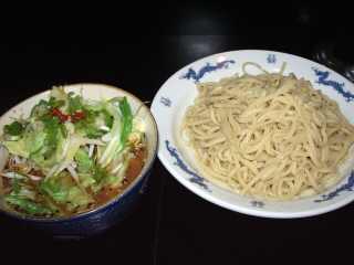 つけだれは、濃い黄土色濁のとんこつ魚系しょうゆ味で、かなり熱く、強い魚系の香りと強い塩味があり、黒・白のゴマ、細粒の一味などスパイス系もかなり強い
