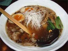トッピングは、ホロホロと崩れるほど柔らかいモモチャーシュー1枚(ちょっとにおいがあり食べ残してしまった)、半熟味玉2/2、メンマ少々、白髪ネギ少々