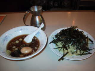 特製もりそば+ねぎ多め @600円+50円 東池袋系統だが、池袋西側に開店(^^ゞ 立教大学のすぐ手前にあり、昼前から学生さんの行列ができ、かなり待つ覚悟が必要である。しかし、店はきれいで余裕もあるので、ゆっくり食べることはできる。 麺は東池袋系にしては少な目の200gで、やや固め 中盛りは300gでサービス つけだれは、魚介の香りが強いもので、微かにとろみを感じる、やや甘みもある メニュー上のデフォルトはラーメンで、それはこちらを。 |